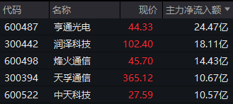 Wind实时监测数据显示,截至午间收盘,申万通信行业获得逾145亿元主力资金净流入,其中,亨通光电获得逾24亿元净流入,润泽科技、烽火通信、天孚通信、中天科技四股也获得超10亿元净流入。