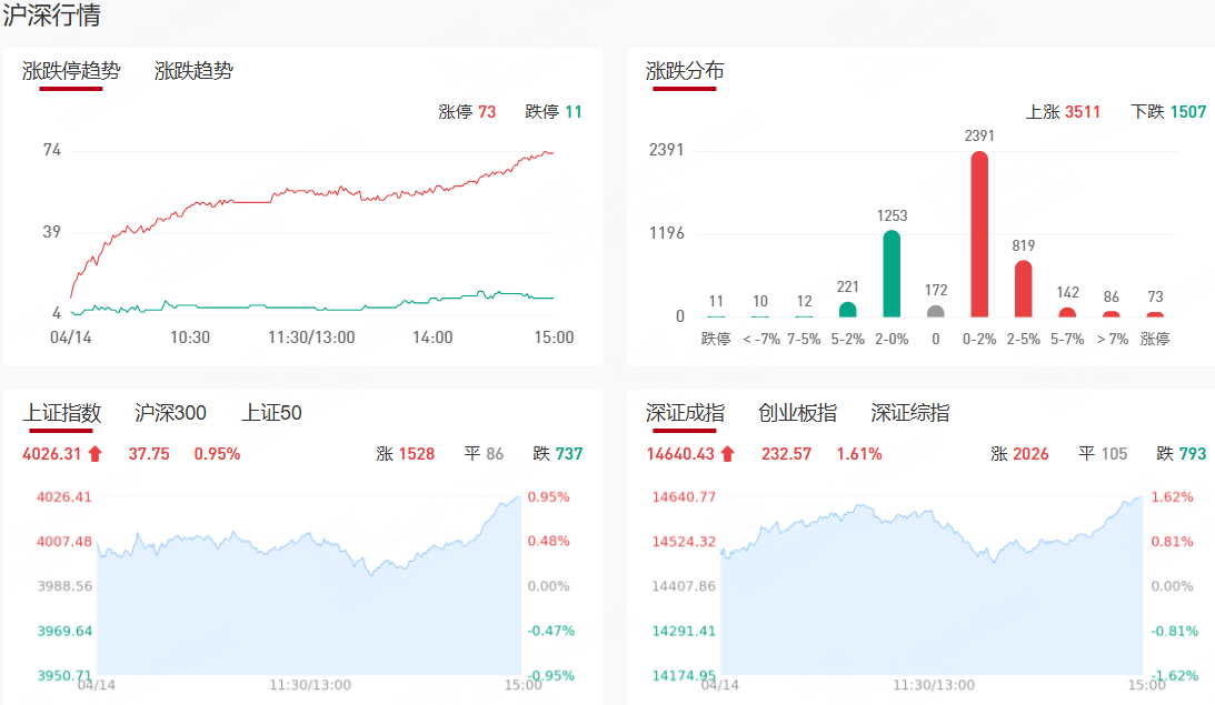 市场震荡反弹,创业板指涨超2%,续创阶段新高,沪指涨近1%重返4000点,深成指涨超1.5%。沪深两市成交额2.38万亿,较上一个交易日放量2334亿。盘面上,市场热点快速轮动,全市场超3700只个股上涨。从板块来看,算力硬件方向反复走强,其中PCB概念爆发,沪电股份、宏昌电子、宏和科技涨停,创历史新高。存储芯片概念快速拉升,江波龙、佰维存储、大为股份大涨创历史新高。液冷服务器概念走高,新朋股份4天3板,海鸥股份涨停。算力租赁概念表现活跃,中嘉博创5天4板,协创数据、利通电子、鸿博股份涨停。锂电池概念反复活跃,石大胜华3天2板,海科新源20cm涨停创新高。下跌方面,油气股集体调整,山东墨龙、石化油服、中曼石油均下挫。