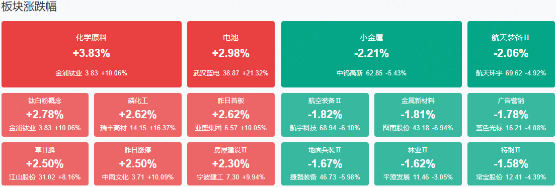 三大指数集体收涨,创业板指冲高回落,此前一度涨超2%,黄白线明显分化。沪深两市成交额2.51万亿,较上一个交易日放量1105亿。盘面上,全市场超3200只个股下跌。从板块来看,化工板块集体反弹,煤化工、盐化工方向领涨,金牛化工、中盐化工、金浦钛业、百川股份、联科科技涨停。绿电概念爆发,绿发电力2连板,节能风电涨停。储能概念反复活跃,正泰电源、首航新能涨停。锂矿概念表现活跃,威领股份4天2板。下跌方面,小金属概念回落,翔鹭钨业、中钨高新均跌超5%。燃气轮机概念走弱,杰瑞股份、图南股份、海联讯集体下挫。
