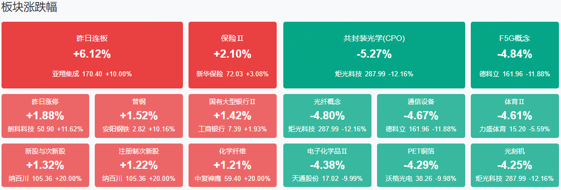 市场全天震荡调整,深成指跌超1%,创业板指跌超2%。量能出现萎缩,沪深两市成交额仅2.21万亿,较上一个交易日缩量1175亿。盘面上,市场热点弱势轮动,全市场超4500只个股下跌。从板块来看,大金融股逆势走强,保险、银行板块领涨,爱建集团涨停,中信银行、新华保险、中国太保集体收涨。化工板块反复活跃,赤天化3连板,三房巷、金正大、潞化科技涨停。房地产板块震荡走高,中洲控股、京能置业涨停。下跌方面,算力硬件、半导体等板块跌幅居前。其中CPO概念集体调整,长光华芯、德科立、罗博特科、光库科技等多股大跌。