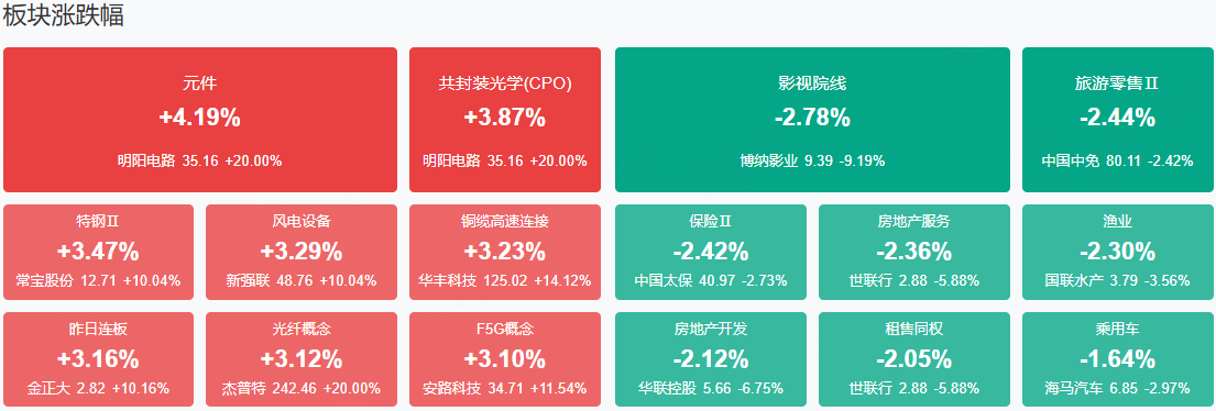 板块方面,算力产业链、电力、小金属等板块表现活跃,影视院线、旅游零售、保险等板块表现落后。截至收盘,沪指跌0.01%,深成指涨0.19%,创业板指跌0.29%。
