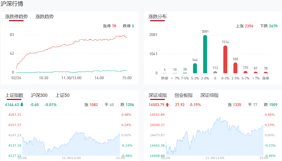 市场探底回升,三大指数涨跌不一,创业板指盘中一度跌超1%,黄白线分化。沪深两市成交额2.54万亿,较上一个交易日放量759亿。盘面上,市场热点快速轮动,全市场超2800只个股下跌。从板块来看,算力硬件方向涨幅居前,PCB、CPO、液冷服务器、算力芯片概念均表现强势,深南电路、大族激光、广合科技、川润股份涨停。电力板块走强,赣能股份2连板,华银电力涨停。燃气轮机概念集体大涨,应流股份、万泽股份、东方电气、常宝股份封涨停。小金属概念表现活跃,云南锗业、章源钨业双双2连板。环保股尾盘拉升,中科环保、启迪环境封涨停。下跌方面,影视院线、保险、房地产等板块跌幅居前。其中影视院线概念股连续大跌,博纳影业触及跌停。