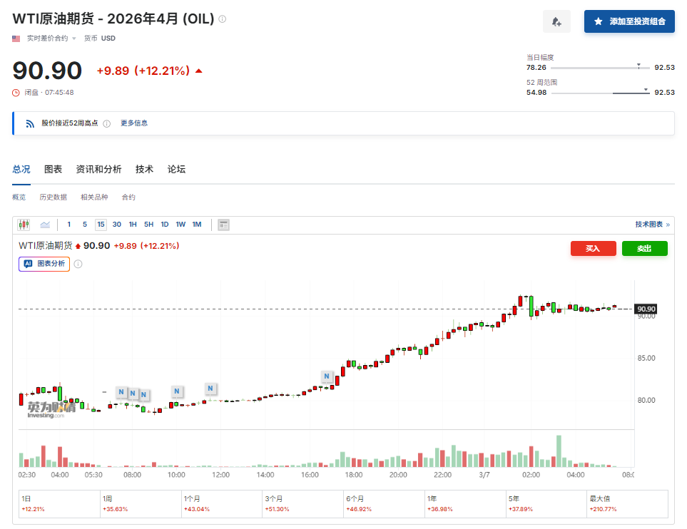 随着恐慌情绪不断发酵,国际基准布伦特原油周五上涨超过8%,WTI原油期货4月合约亦上涨超12%,双双突破每桶90美元。投资者愈发担心,如果油价持续高企,可能会对经济造成严重后果。他们将当前情况与上世纪70年代石油价格冲击作对比,当时原油价格飙升导致了滞胀。