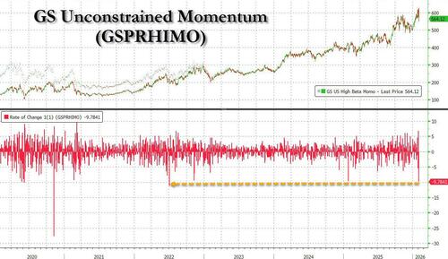 动量交易简单说来就是“买入最近涨得最好的,卖出涨得最差的”。而根据业内的统计,高盛的“高贝塔”或无约束动量组合(GSPRHIMO)刚刚创下了自2022年以来表现最糟糕的一天,超过了去年1月Deepseek风暴之后的AI抛售潮。高贝塔股通俗而言就是指那些波动比大盘更剧烈的股票。