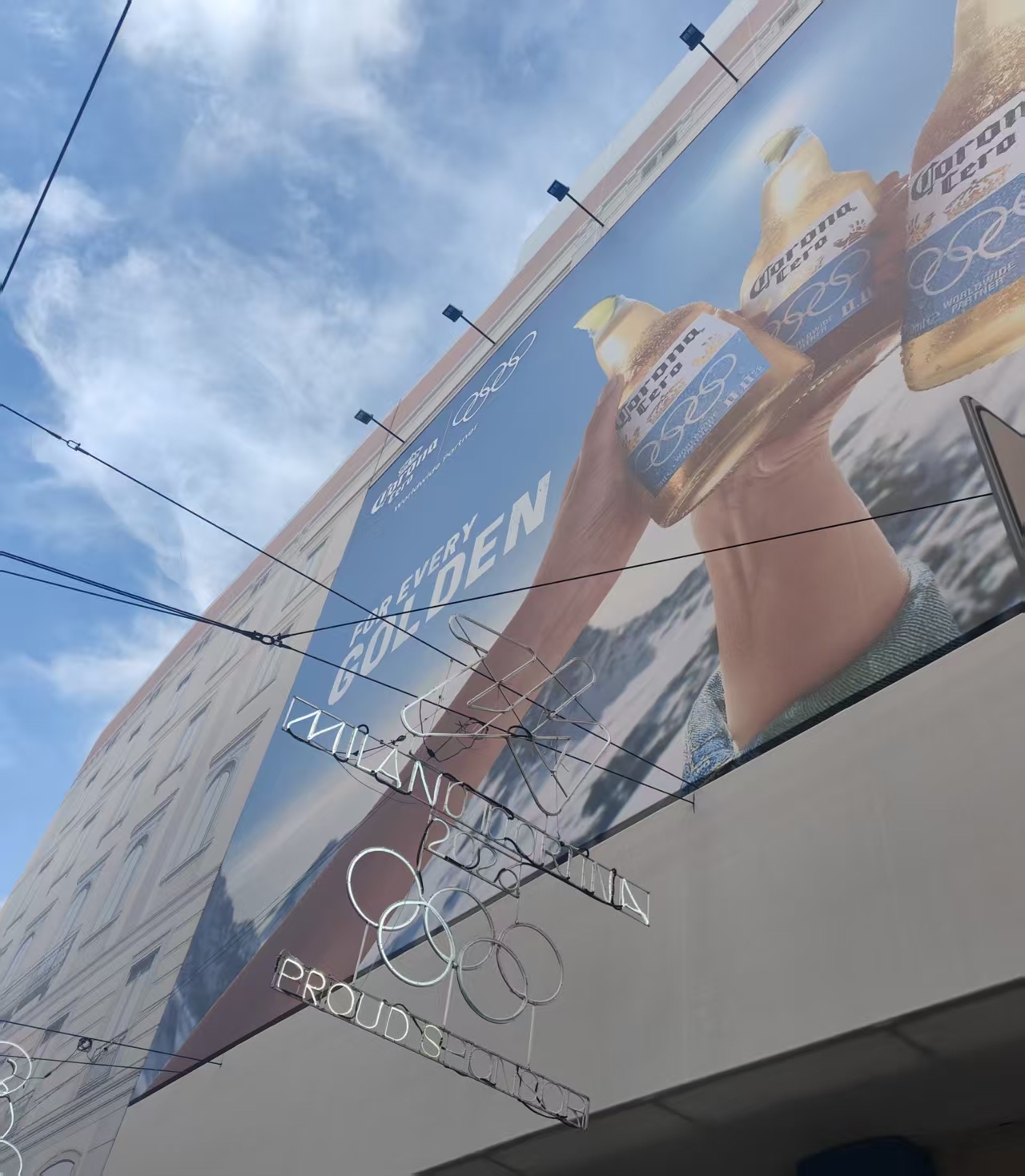 原则上,米兰市中心的建筑高度不能超过大理石构建的米兰大教堂,高楼不多,要抢到巨幅户外广告位并不容易,但奥运赞助商们还是找到一些明显的露出位置。TCL的巨幅户外广告牌背景是双板滑雪的画面,旁边的广告牌登出该公司旗下的空调、洗衣机等产品。三星、百威英博旗下科罗娜的冬奥主题户外广告牌也很大,画面展示了手机、啤酒。