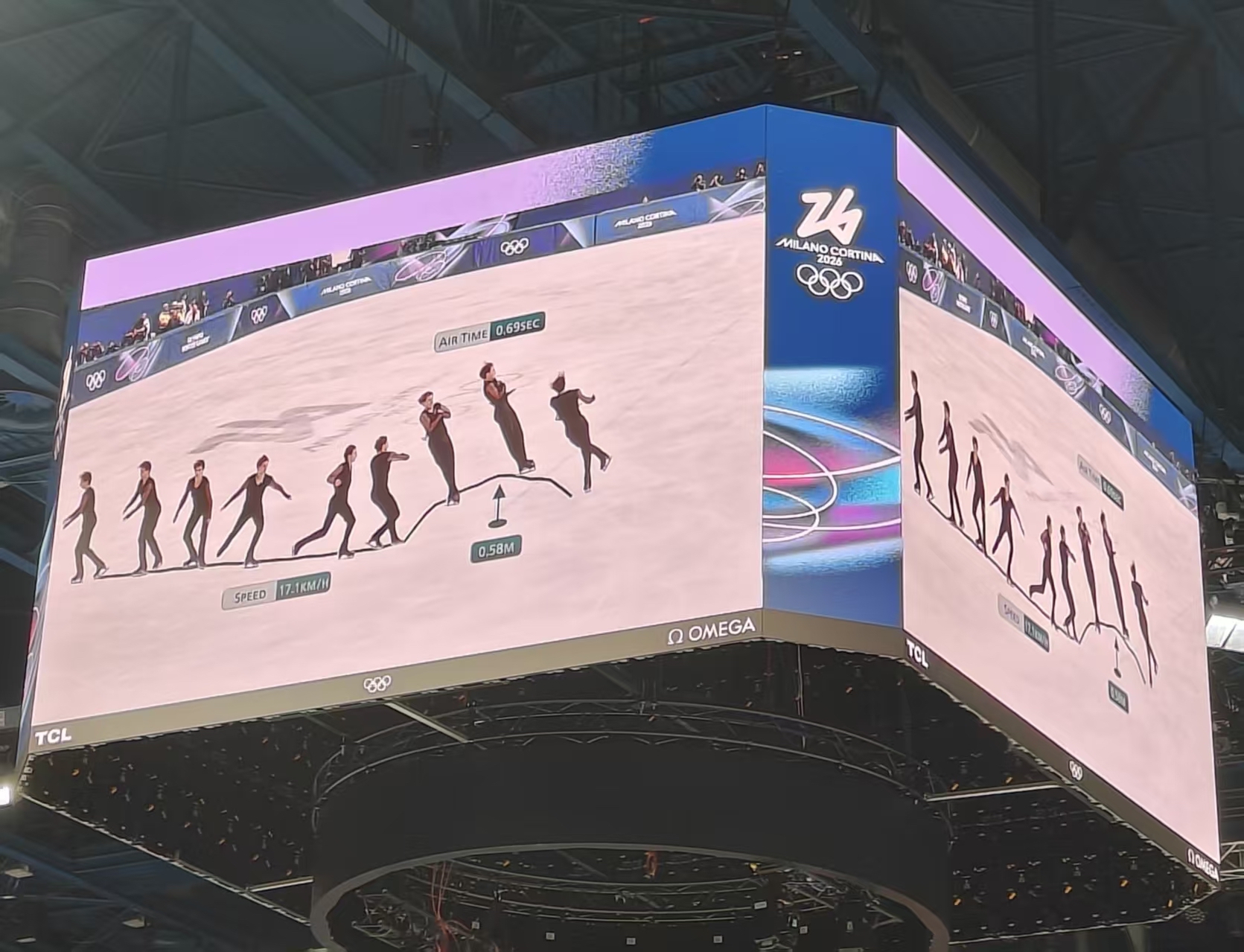 不仅在奥运村,冬奥赛场内,TOP赞助商的身影也频繁出现。赛场不能带进瓶装水,而在场馆内买水,总能看到可口可乐或旗下品牌的产品。记者看到,赛场中的屏幕印着TCL和OMEGA的标识。当屏幕中花样滑冰运动员的动作被慢放,显示切片运动轨迹,用到的则是阿里云的技术,该公司还将AI增强的转播特效技术部署在多个场馆。