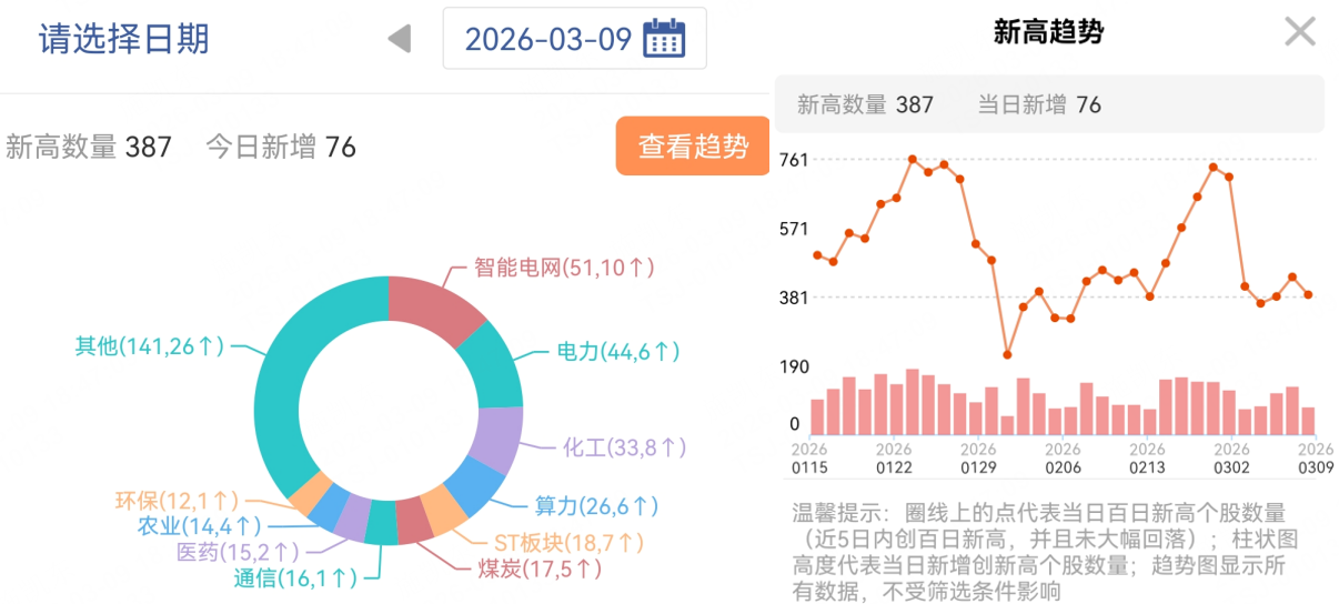 从百日新高去看,板块新高数量前4:智能电网>电力>化工>算力