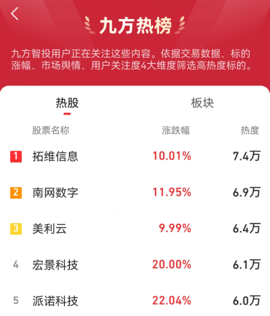 九方热榜:拓维信息,南网数字,美利云,宏景科技,派诺科技