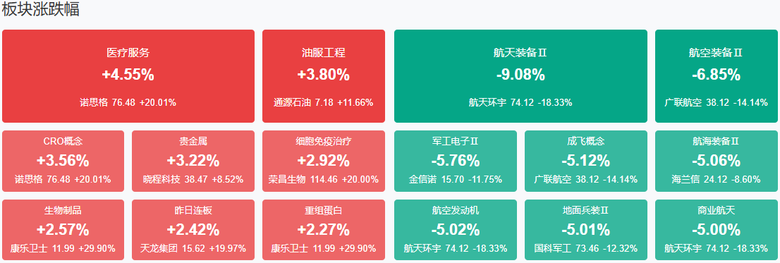 板块题材上,AI医疗&创新药、石油、贵金属等板块涨幅居前;商业航天、可控核聚变等板块表现落后。截至收盘,沪指跌0.64%,深成指跌1.37%,创业板指跌1.96%。