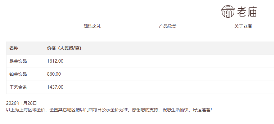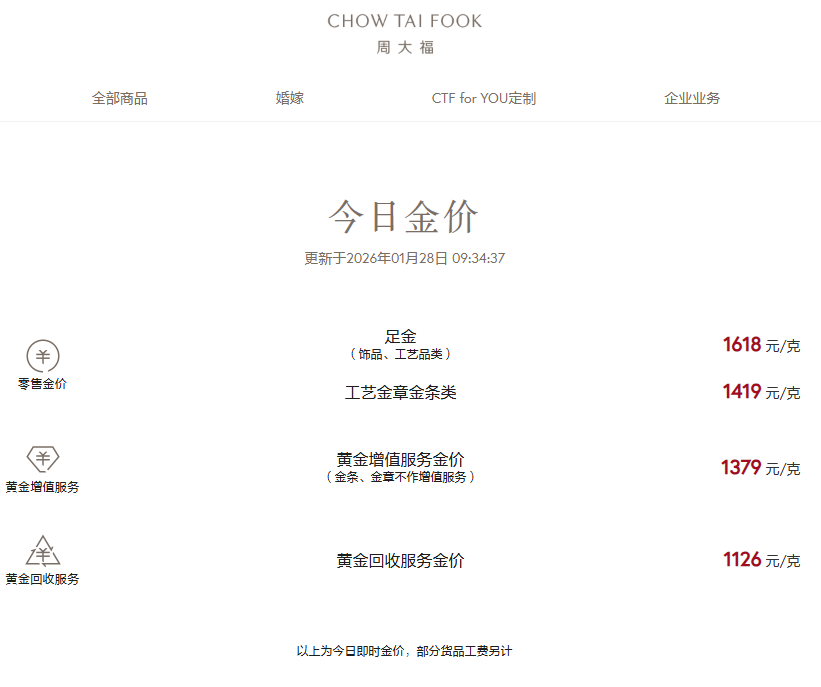 周生生报价1614元/克,周大福报价1618元/克,老凤祥报价1620元/克,老庙黄金报价1612元/克。