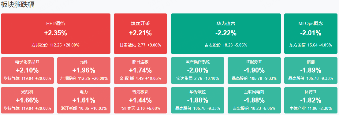 板块方面,商业航天、绿色电力、工业气体等板块表现活跃,液冷服务器等板块表现落后。截至收盘,沪指涨0.07%,深成指涨0.1%,创业板指涨0.31%。