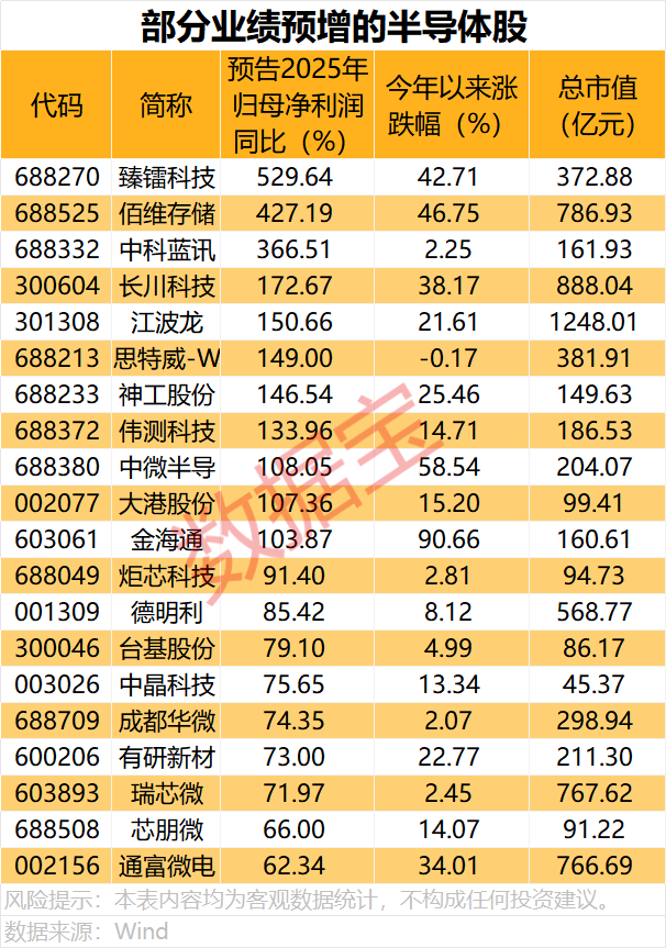据证券时报·数据宝统计,A股中属于半导体细分行业的个股共有173只,目前已有124股发布2025年度业绩预告、业绩快报或年报,其中46股净利润预增,13股预计扭亏,22股预计减亏(归母净利润按年报、业绩快报、业绩预告下限计算)。
