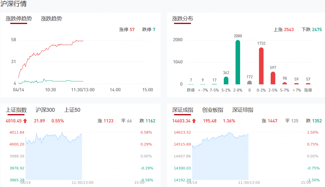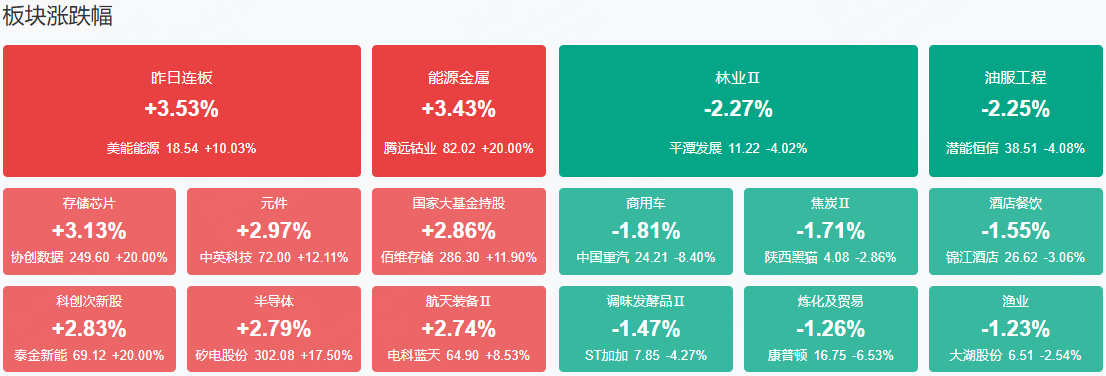 创业板指涨超2%,续创阶段新高,深成指均涨超1%。黄白线明显分化,权重股走势较强。沪深两市半日成交额1.5万亿,较上个交易日放量948亿。盘面上热点快速轮动,全市场近2700只个股上涨。从板块来看,算力产业链反复走强,其中PCB概念爆发,沪电股份、宏昌电子、宏和科技、大族激光涨停,创历史新高。存储芯片概念持续拉升,江波龙、佰维存储、大为股份大涨创历史新高。算力租赁概念集体走强,中嘉博创5天4板,协创数据20CM涨停。CPO概念表现活跃,长光华芯、中际旭创续创历史新高。下跌方面,油气股集体调整,潜能恒信、通源石油、科力股份均下挫。