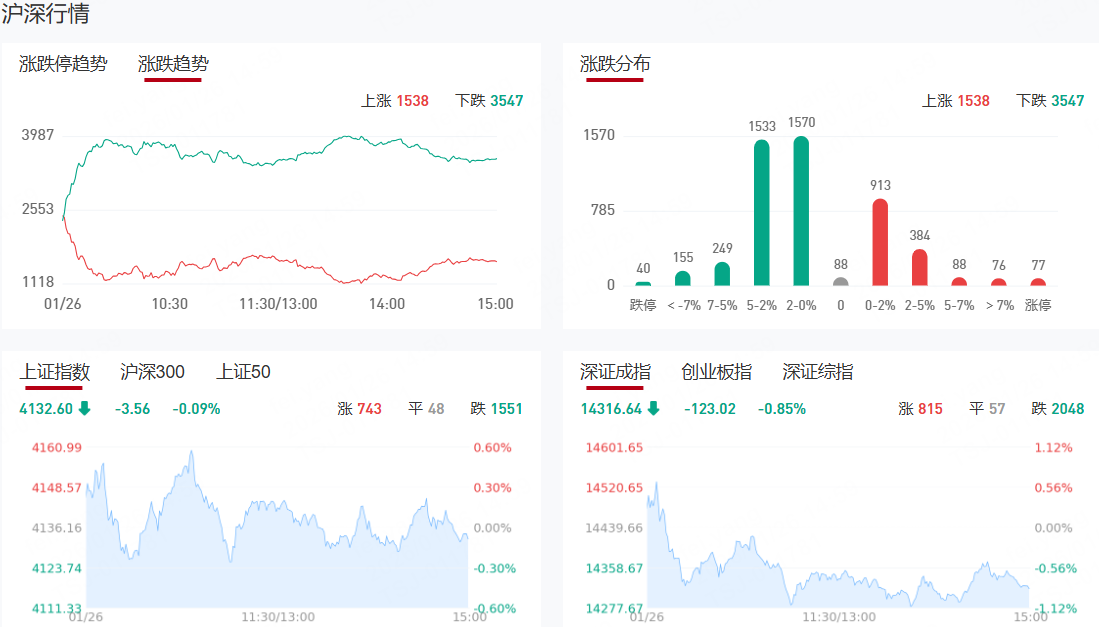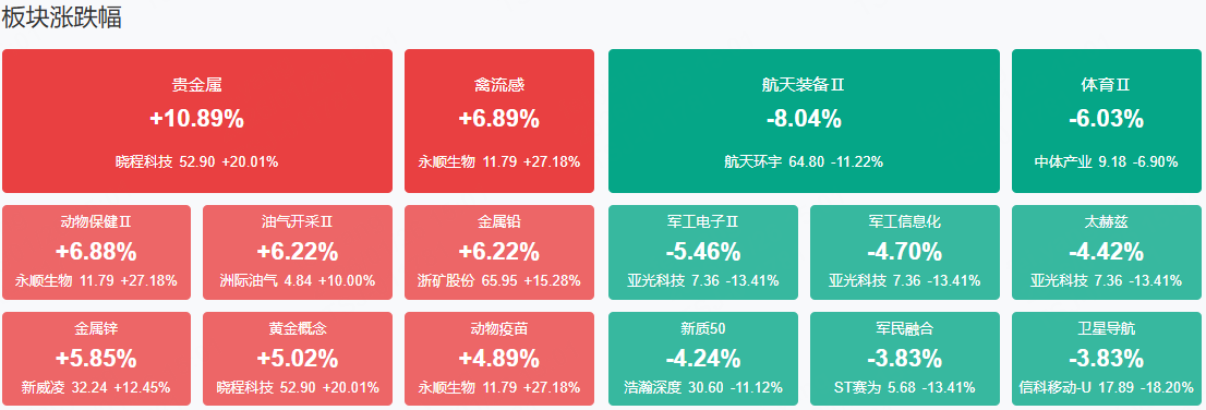 板块方面,贵金属、生物疫苗、石油、大金融等板块表现活跃,商业航天、半导体等板块表现落后。截至收盘,沪指跌0.09%,深成指跌0.85%,创业板指跌0.91%。