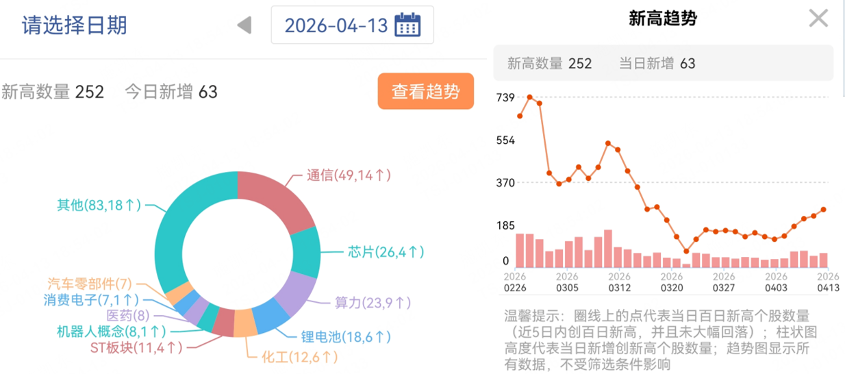 从百日新高去看,板块新高数量前4:通信>芯片>算力>锂电池