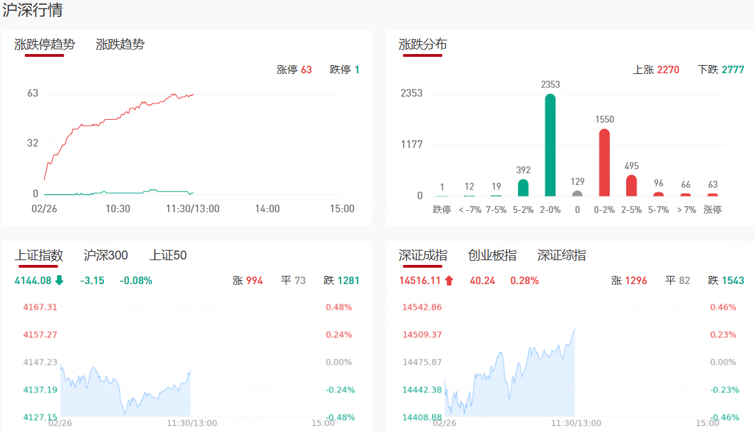 早盘三大指数涨跌不一,深成指探底回升翻红,创业板指走势稍弱,黄白线明显分化。沪深两市半日成交额1.64万亿,较上个交易日放量1173亿。盘面上热点快速轮动,全市场超2900只个股下跌。从板块来看,算力硬件股持续活跃,PCB、CPO、液冷服务器概念均表现强势,深南电路、大族激光、沪电股份、广合科技、川润股份涨停。电力板块走强,赣能股份2连板,华银电力涨停。燃气轮机概念集体拉升,东方电气、常宝股份封涨停。小金属概念表现活跃,云南锗业2连板,章源钨业触及涨停。下跌方面,锂电池板块盘中震荡回落,鹏辉能源跌超9%。影视院线再度下挫,博纳影业大跌。