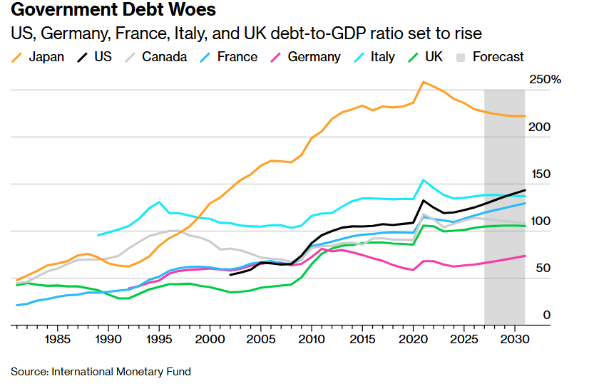 日本主权债务的超级大崩盘也凸显出市场对全球主要发达经济体财政状况的担忧,助推所谓的“主权货币贬值交易”(debasement trade),即投资者们纷纷回避货币与政府债券。