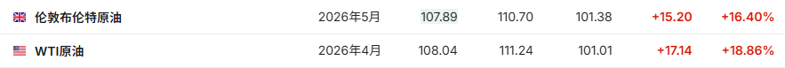 随着关键航道几乎完全关闭、更多主要产油国削减产量、以及美国威胁加深这场已经颠覆能源市场的冲突,国际铀价飙升至每桶110美元以上。周一,布伦特原油期货一度飙升20%至每桶111.04美元,WTI原油期货则大涨22%。截至发稿,布伦特原油期货涨超16%,报107.89美元/桶;WTI原油期货涨近19%,报108.04美元/桶。