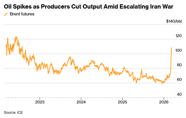 在美以对伊朗发动空袭逾一周后,中东战争丝毫没有缓和的迹象。经由霍尔木兹海峡(这条狭窄水道通常处理全球五分之一的石油)的运输中断、以及对能源基础设施的攻击,推高了原油和天然气价格。与此同时,中东地区储油设施迅速被填满,阿联酋和科威特已开始减少产量。伊拉克上周也开始停产。