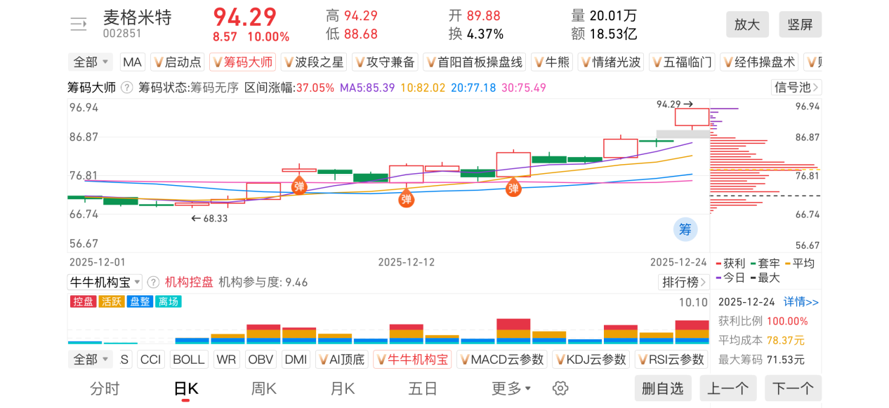 2)20251224-麦格米特-002851-【筹码大师】和【牛牛机构宝】-近期出现弹信号且底部量柱由绿转红