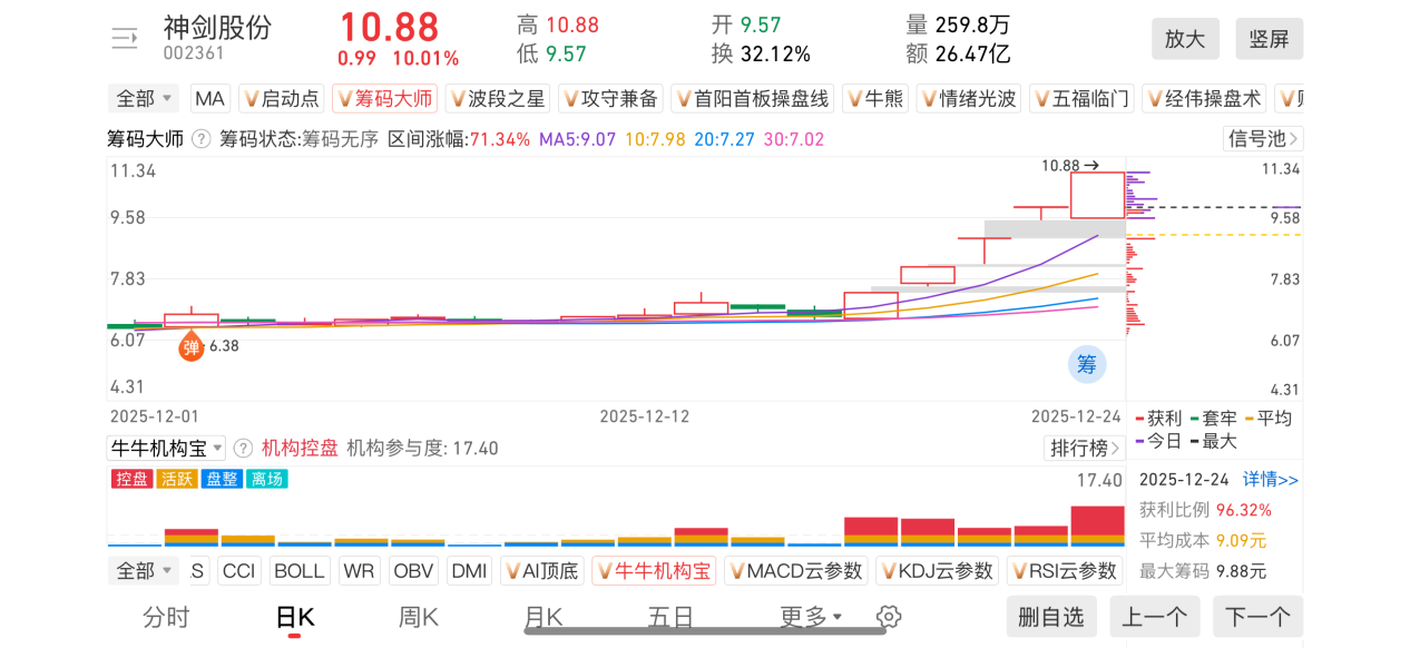 1)20251224-神剑股份-002361-【筹码大师】和【牛牛机构宝】-近期出现弹信号且底部量柱由绿转红