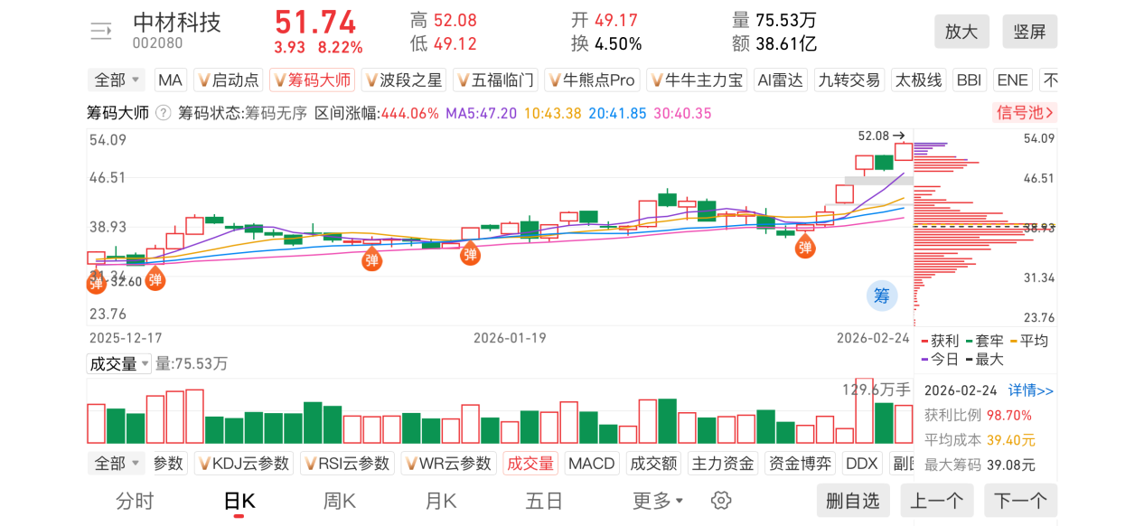 1)20260224-中材科技-002080-【筹码大师】和【牛牛机构宝】-近期出现弹信号且底部量柱由绿转红