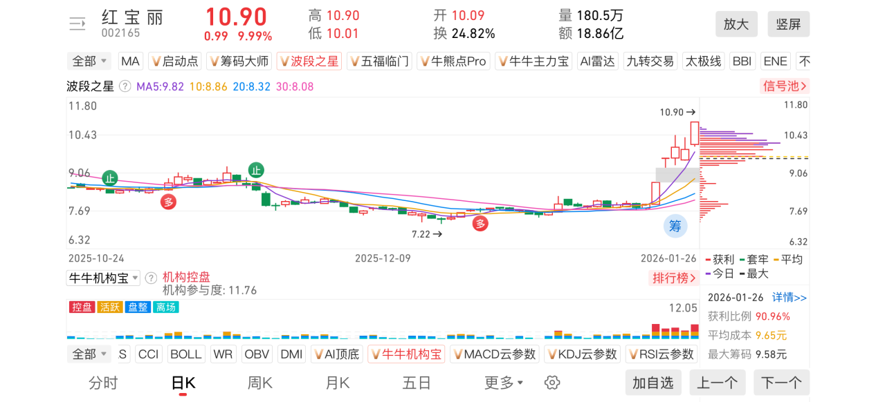 根据“波动之星”监控,今日大涨的化工龙头红宝丽,主力在12月23日出现波段看多信号。