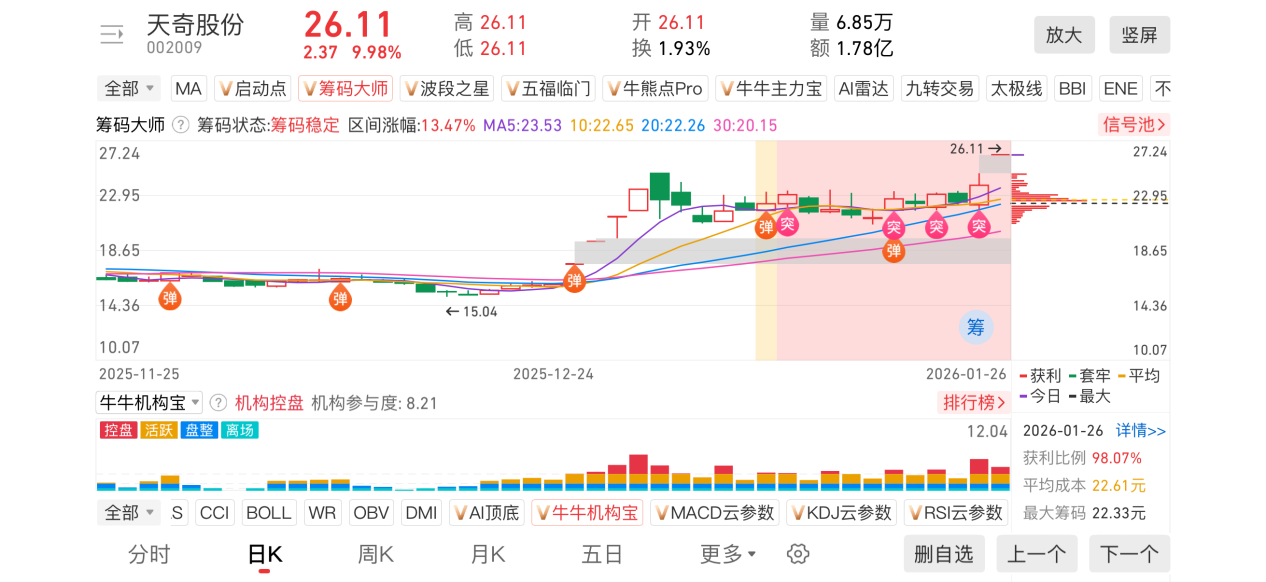 1)20260126-天奇股份-002009-【筹码大师】和【牛牛机构宝】-近期出现弹信号且底部量柱由绿转红