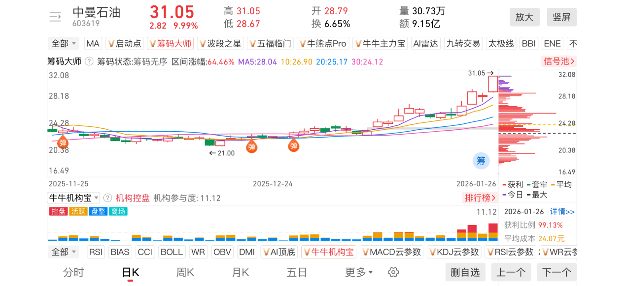 2)20260126-中曼石油-603619-【筹码大师】和【牛牛机构宝】-近期出现弹信号且底部量柱由绿转红