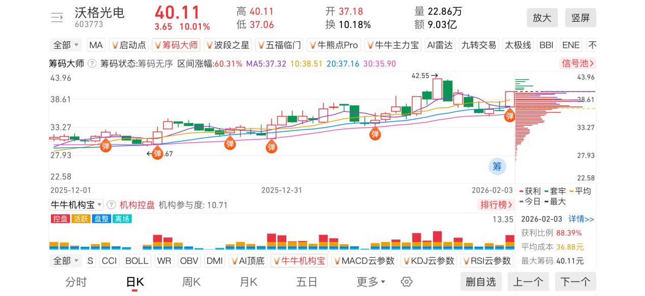 2)20260203-沃格光电-603773-【筹码大师】和【牛牛机构宝】-近期出现弹信号且底部量柱由绿转红