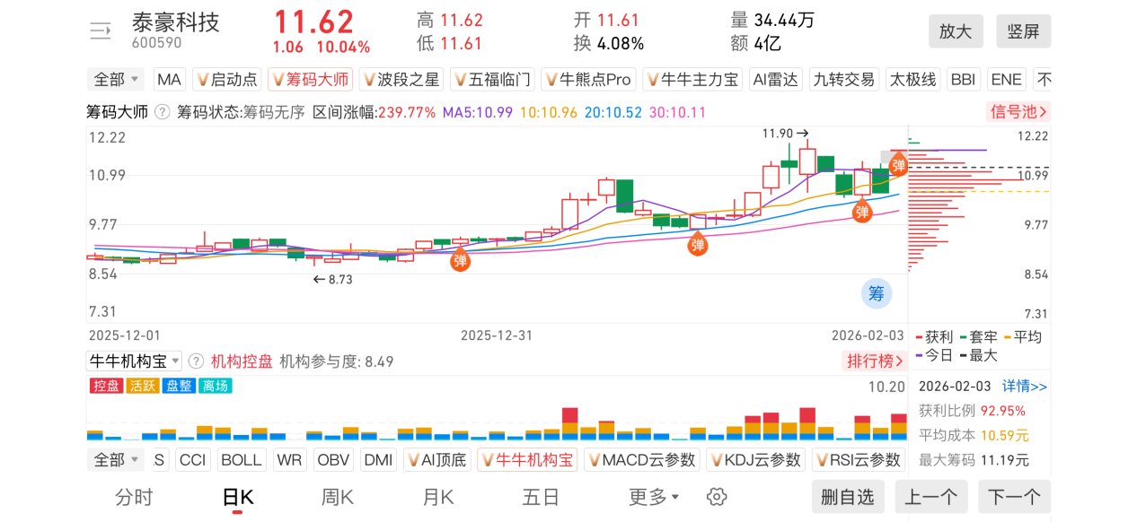 3)20260203-泰豪科技-600590-【筹码大师】和【牛牛机构宝】-近期出现弹信号且底部量柱由绿转红