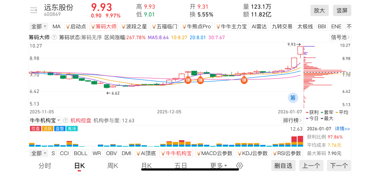 1)20260107-远东股份-600869-【筹码大师】和【牛牛机构宝】-近期出现弹信号且底部量柱由绿转红