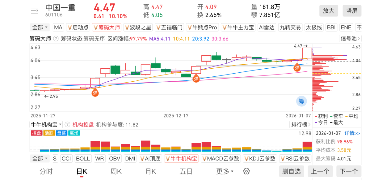 4)20260107-中国一重-601106-【筹码大师】和【牛牛机构宝】-近期出现弹信号且底部量柱由绿转红