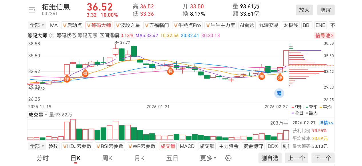 2)20260227-拓维信息-002261-【筹码大师】和【牛牛机构宝】-近期出现弹信号且底部量柱由绿转红