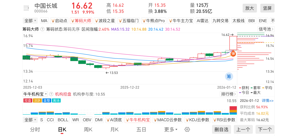 2)20260112-中国长城-000066-【筹码大师】和【牛牛机构宝】-近期出现弹信号且底部量柱由绿转红