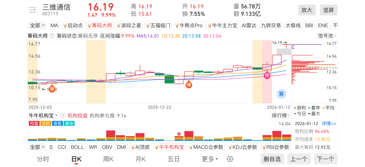 1)20260112-三维通信-002115-【筹码大师】和【牛牛机构宝】-近期出现弹信号且底部量柱由绿转红