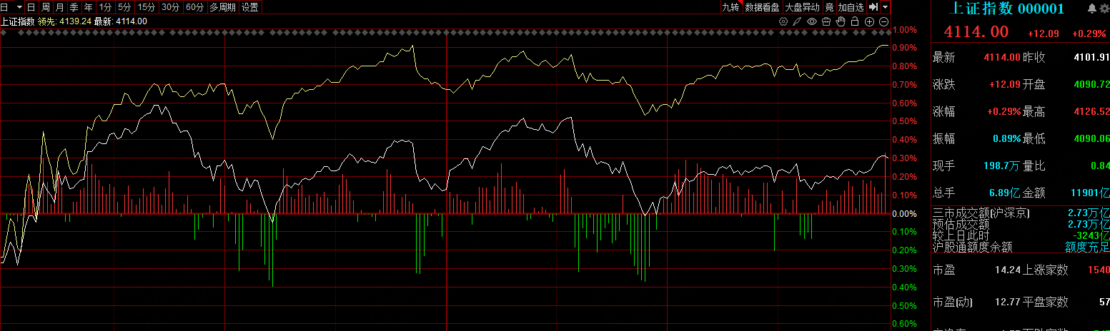 上证指数涨0.29%,深证成指涨0.09%,创业板指跌0.7%。全市个股涨多跌少,全市上涨个股超3500只;全市全天成交2.71万亿元,较上一日缩量成交3179亿元,内资主力资金净卖出424.1亿元,涨跌中位数为0.77%。