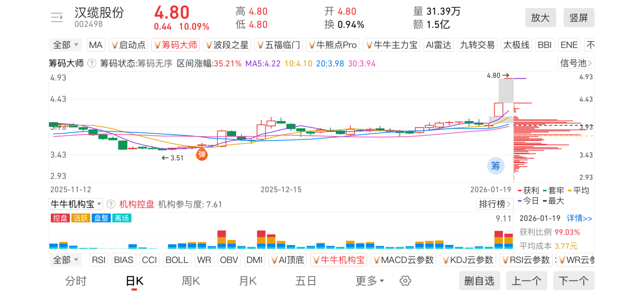 1)20260119-汉缆股份-002498-【筹码大师】和【牛牛机构宝】-近期出现弹信号且底部量柱由绿转红