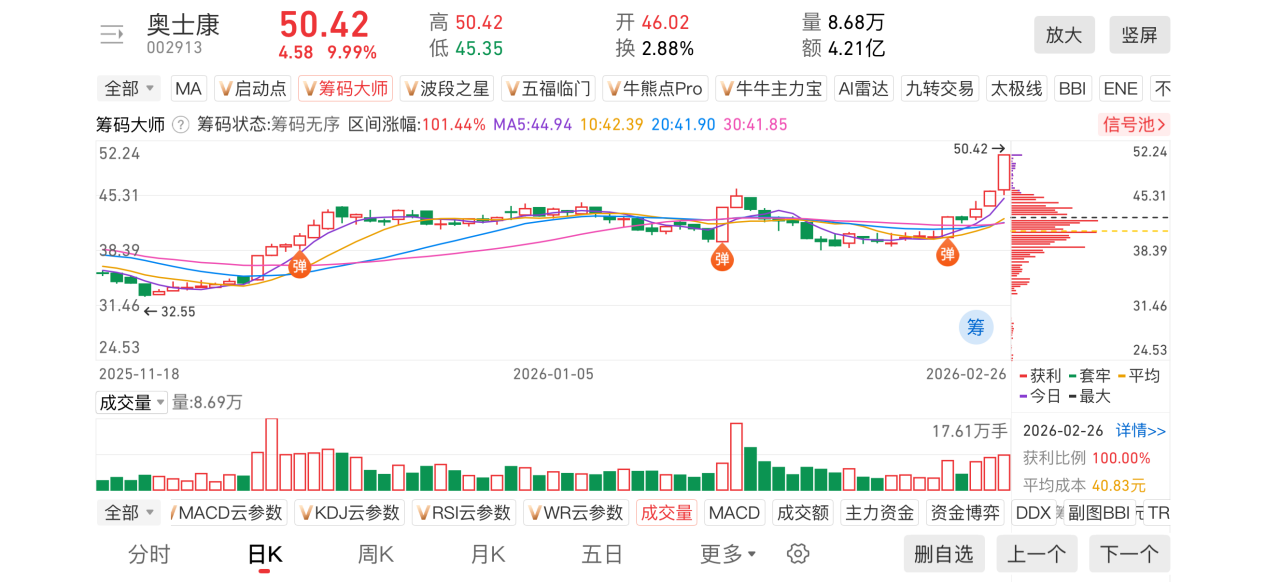 1)20260226-奥士康-002913-【筹码大师】和【牛牛机构宝】-近期出现弹信号且底部量柱由绿转红