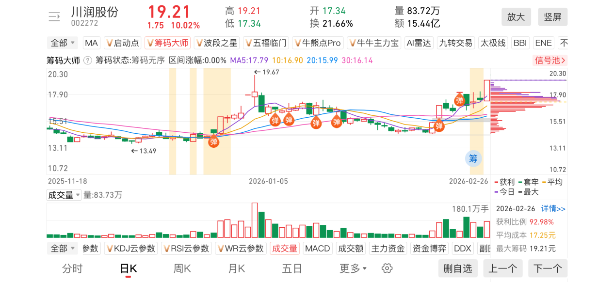 3)20260226-川润股份-002272-【筹码大师】和【牛牛机构宝】-近期出现弹信号且底部量柱由绿转红