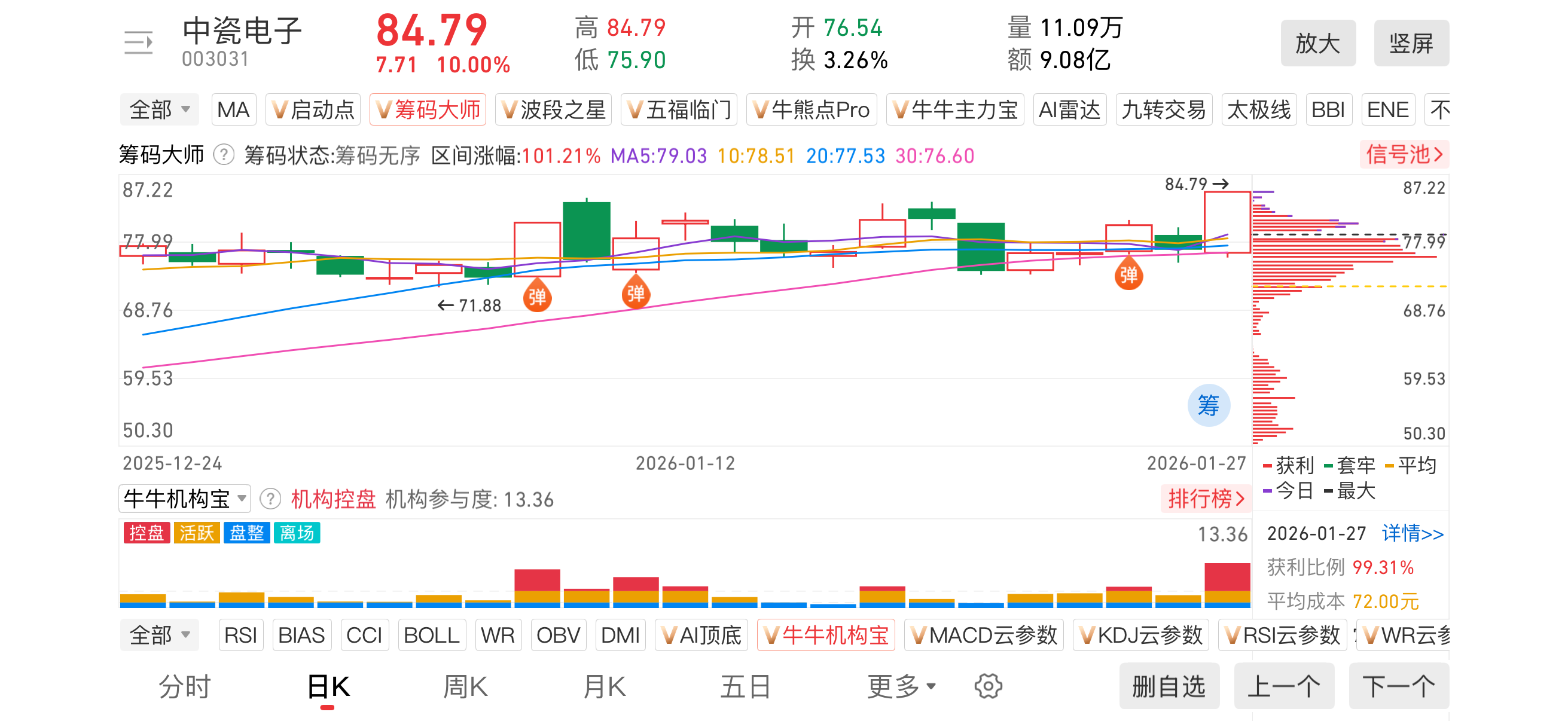 1)20260127-中瓷电子-003031-【筹码大师】和【牛牛机构宝】-近期出现弹信号且底部量柱由绿转红