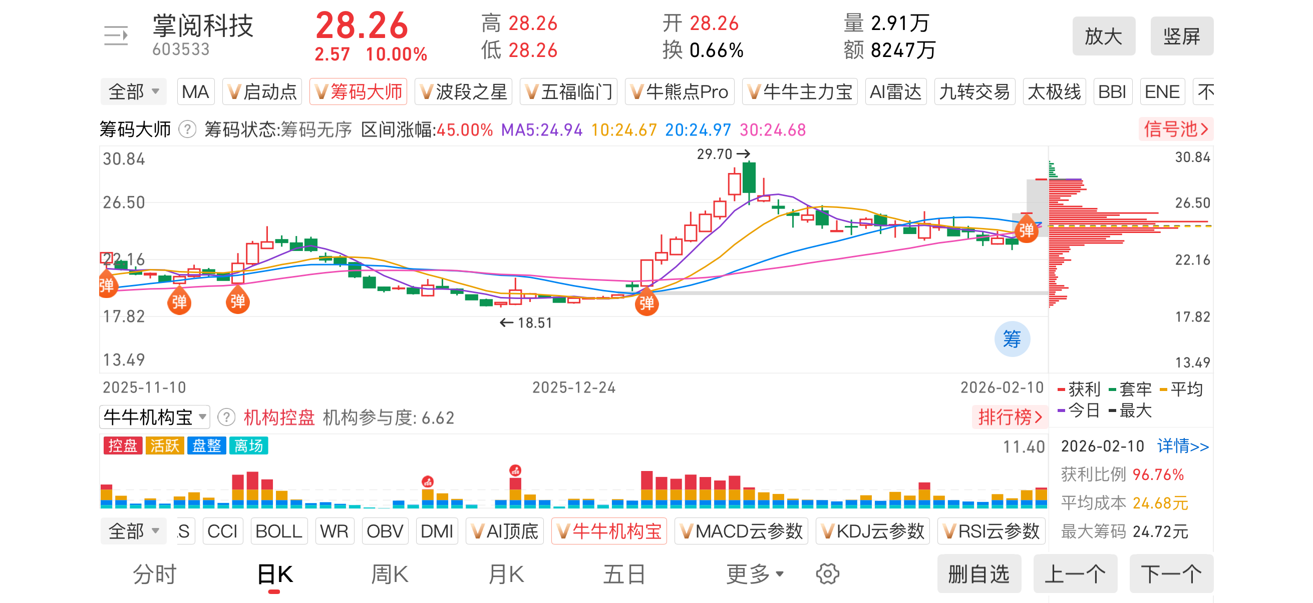 1)20260210-掌阅科技-603533-【筹码大师】和【牛牛机构宝】-近期出现弹信号且底部量柱由绿转红