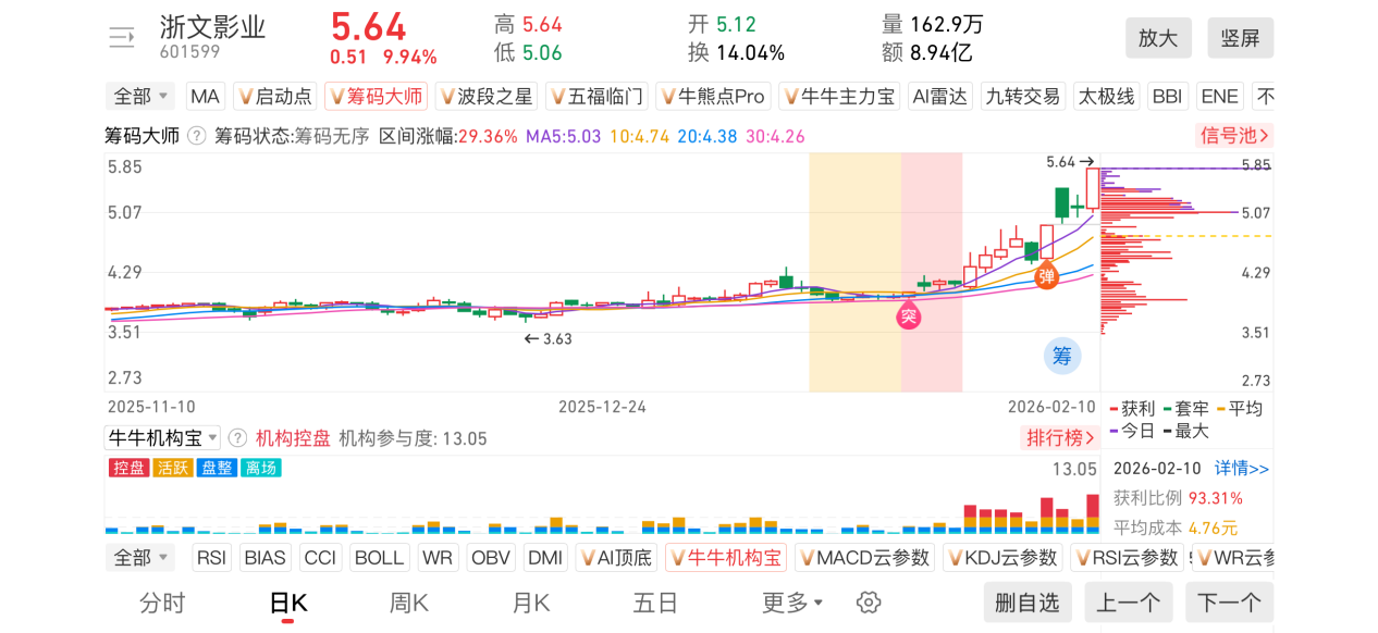 2)20260210-浙文影业-601599-【筹码大师】和【牛牛机构宝】-近期出现弹信号且底部量柱由绿转红