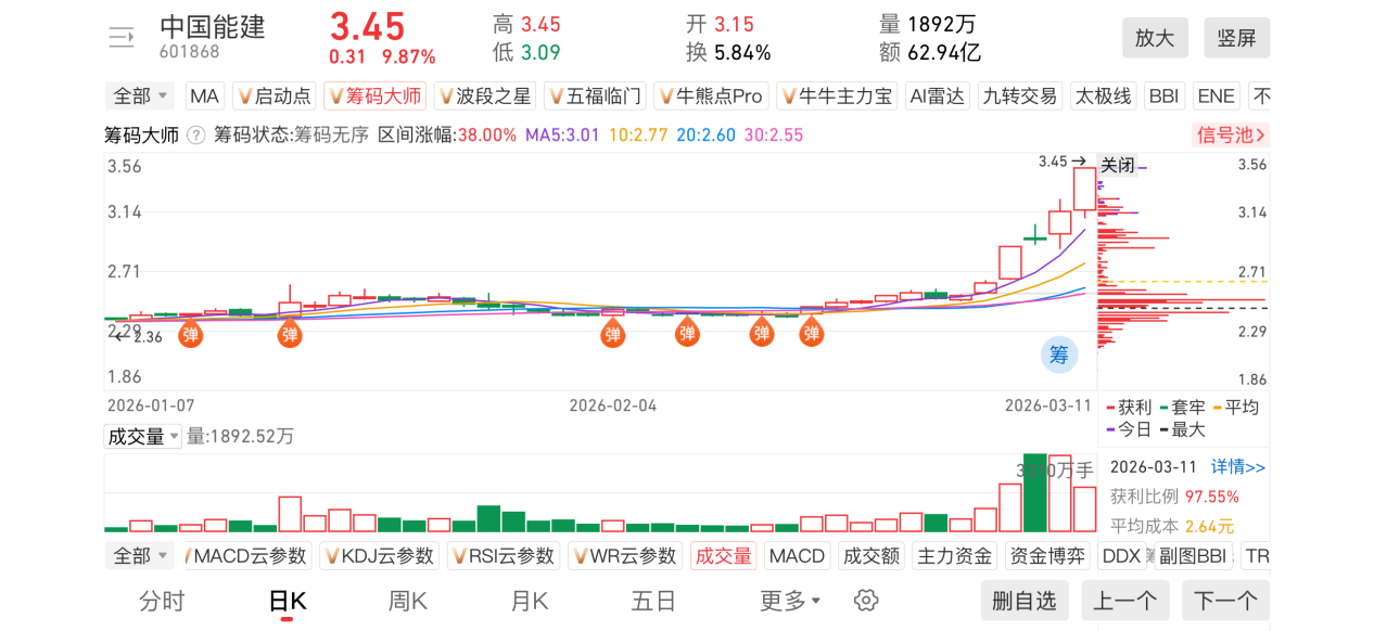 1)20260311-中国能建-601868-【筹码大师】和【牛牛机构宝】-近期出现弹信号且底部量柱由绿转红