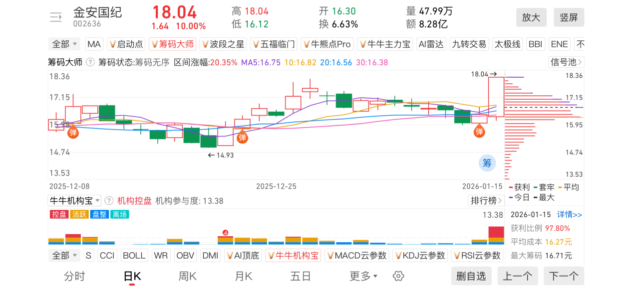 2)20260115-金安国纪-002636-【筹码大师】和【牛牛机构宝】-近期出现弹信号且底部量柱由绿转红