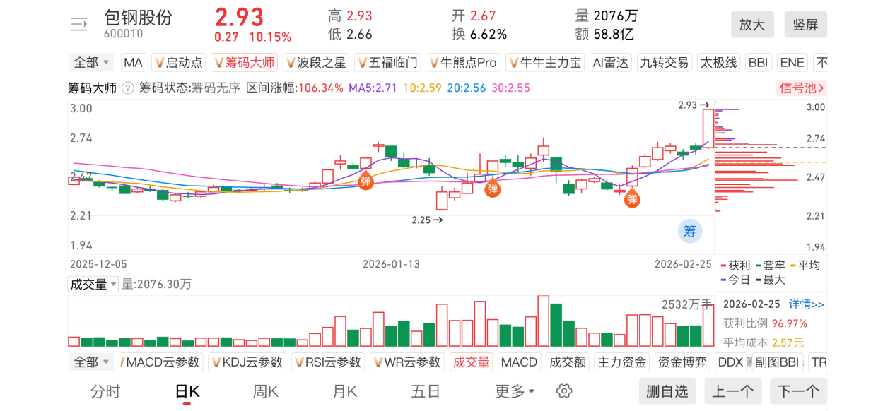 2)20260225-包钢股份-600010-【筹码大师】和【牛牛机构宝】-近期出现弹信号且底部量柱由绿转红