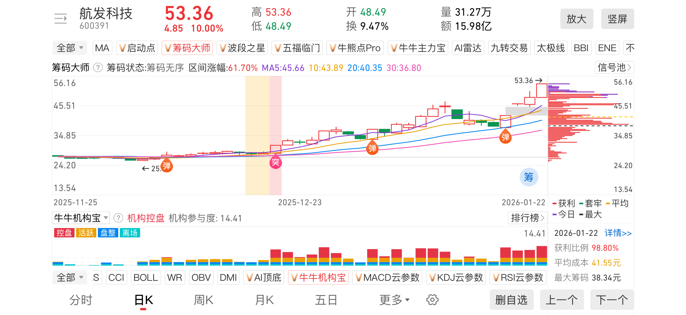2)20260122-航发科技-600391-【筹码大师】和【牛牛机构宝】-近期出现弹信号且底部量柱由绿转红