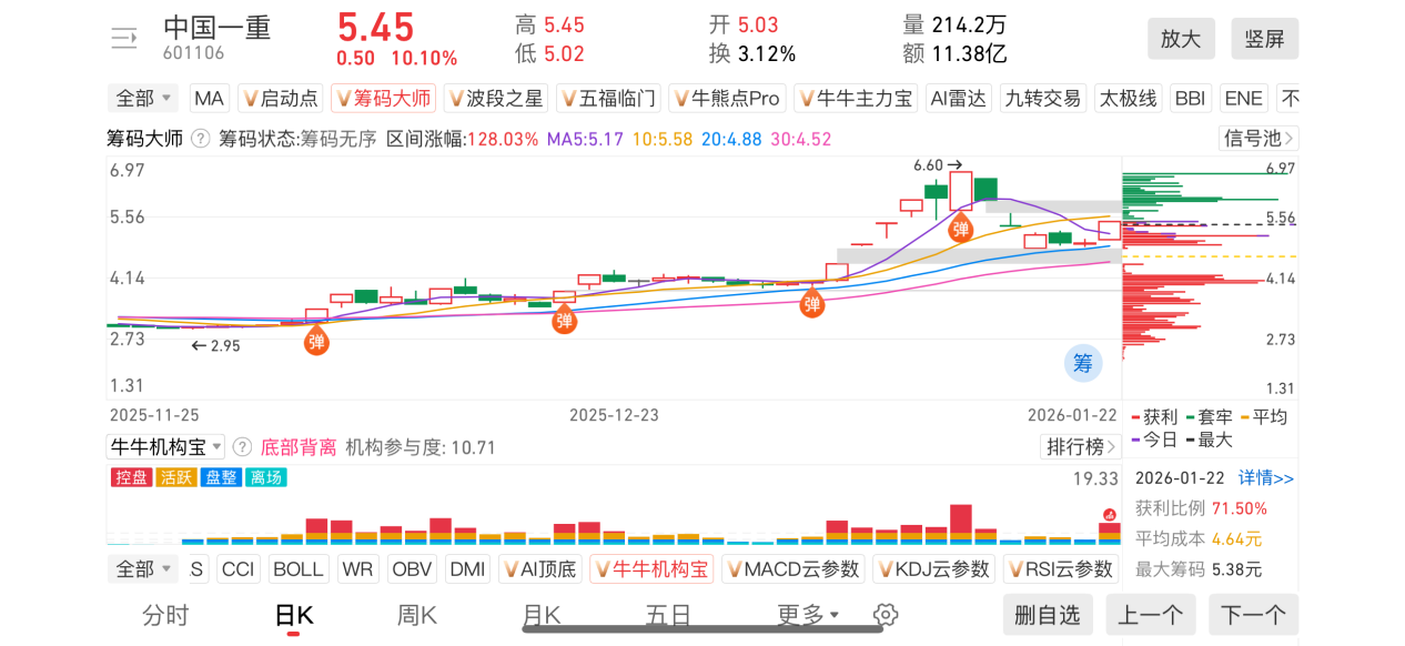 1)20260122-中国一重-601106-【筹码大师】和【牛牛机构宝】-近期出现弹信号且底部量柱由绿转红
