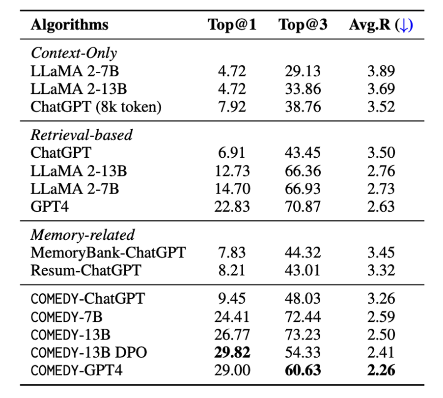 DPO(直接偏好优化)的增强效果:DPO的应用进一步提升了压缩记忆策略,改善了对话的记忆性、一致性和人类自然表达程度。在压缩记忆类别中,COMEDY-13B DPO展现出显著的性能提升。该方法在Top@1排名中获得最高,并在基于记忆的对话整体质量上显示出实质性提升。