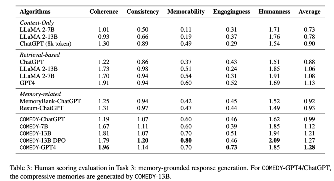 压缩记忆方法的优越性:压缩记忆方法,特别是COMEDY-GPT4,在大多数指标上都持续优于仅基于上下文和基于检索的方法。例如COMEDY-GPT4在相关性和用户吸引度两个方面都获得了最高分,表明其能够生成既符合上下文又具有吸引力的回复。COMEDY-GPT4在五个评估维度的评分和排名中也取得了最佳平均表现。